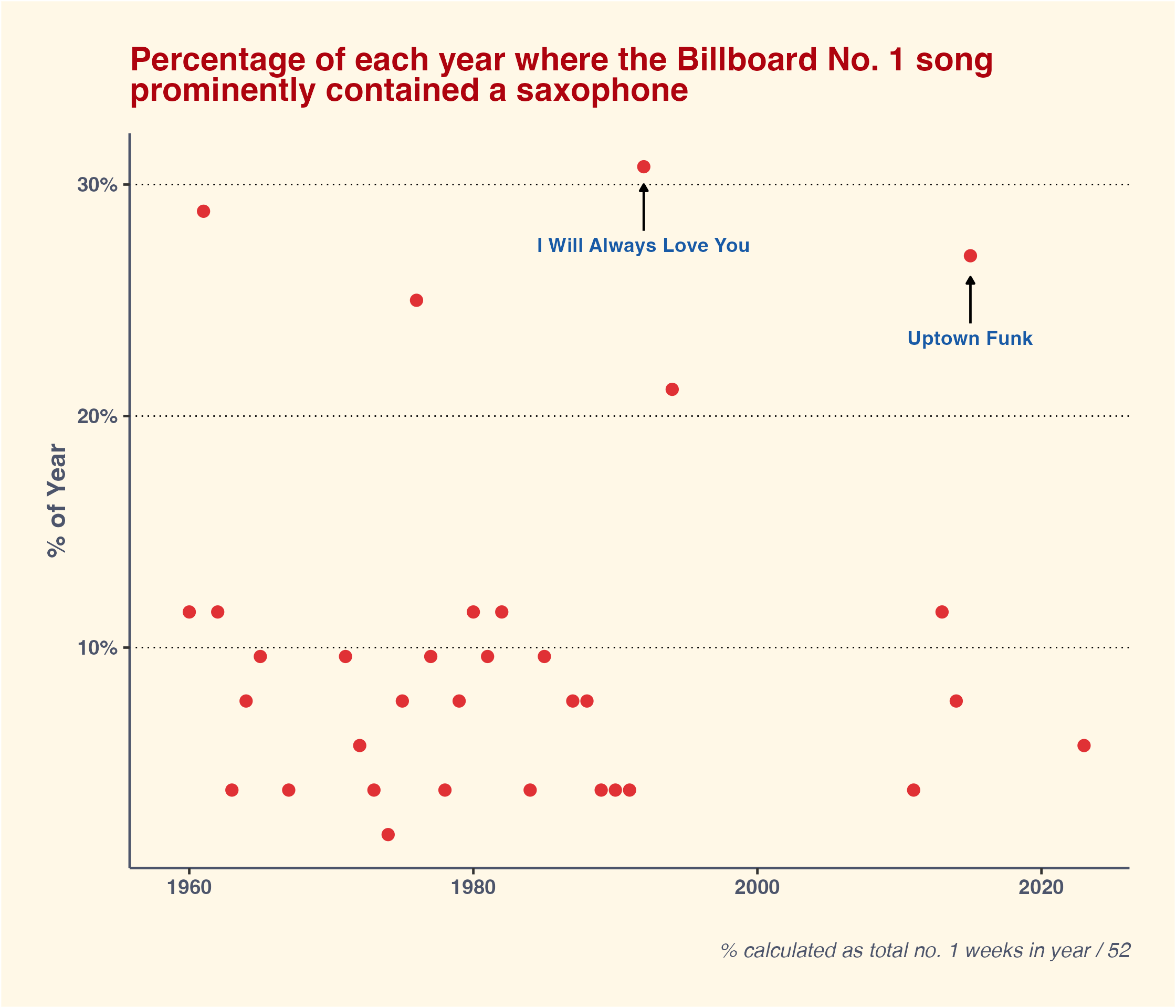 title = "Percentage of each year where the Billboard No. 1 song <br> prominently contained a saxophone",